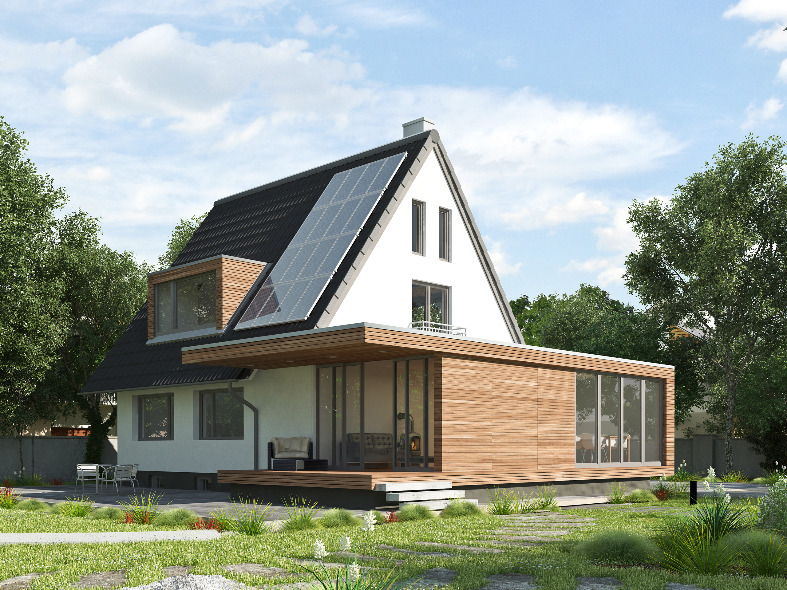 Ein Anbau am hinteren Teil des Hauses erweitert die Wohnfläche, ohne die Frontansicht zu verändern. Holz erleichtert die Umsetzung und reduziert den Aufwand für Fassadenarbeiten, während neue Räume unauffällig ins Haus integriert werden.