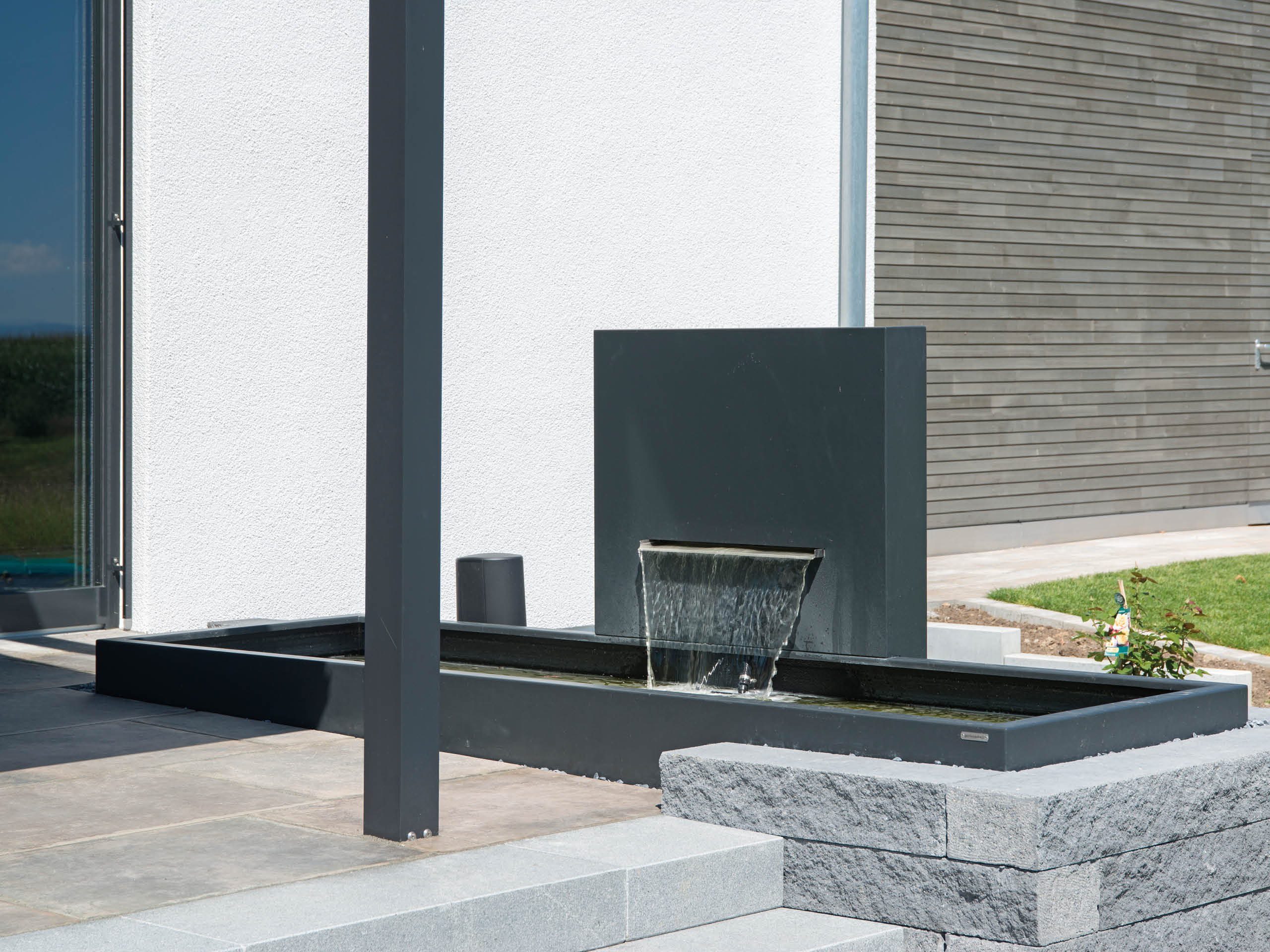 Die klare Linienführung des symmetrischen Baukörpers wird äußerlich durch einen gut geschützten Freisitz im Außeneck des Obergeschosses aufgelockert. Beim Eintreten lädt eine ansprechende Mischung aus Erdtönen, Eichenholz, Sichtbeton und schwarzen Flächen zum Genießen und Entspannen ein. Unterstützt wird dieses edle Raumgefühl durch ein angenehmes Raumklima vom Obergeschoss bis in den Keller ‒ letzterer hält einen besonderen Vorteil für den Bauherren bereit: „Ich bin Weinliebhaber und genieße es, dass ich Rot und Weiß im Keller perfekt temperieren kann.“