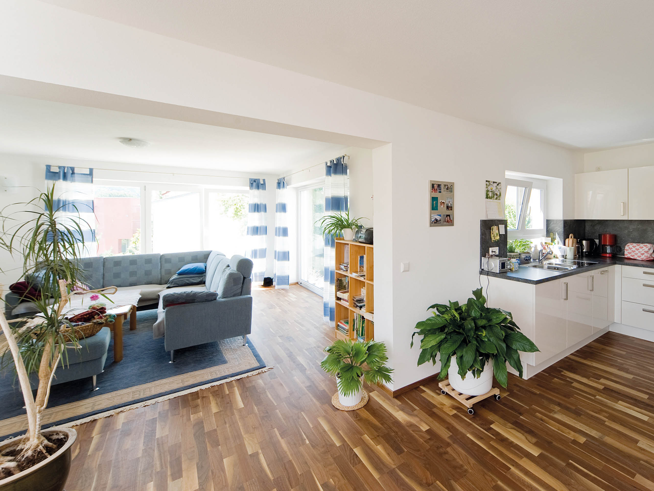 Rückblickend war lediglich das Erdgeschoss des Bestands bewohnbar. Das Gebäude musste also grundlegend saniert und energetisch optimiert werden. Im selben Zuge bot sich der Ausbau des Dachgeschosses an. Die durchdachte Dachgeometrie machte die zweigeschossige Bauweise sogleich genehmigungsfähig. Aufgrund des Pultdachs blieb die Firsthöhe des Bestandsgebäudes nahezu erhalten. Das komplette Raumgefüge wird von großen Glasflächen geprägt. Der entstandene Loftcharakter sagte dem Bauherren so sehr zu, dass er selbst in die obere Wohnung einzog. Auch die untere Wohnung erhielt ein Upgrade. Sie überzeugt durch den hellen Wohnbereich mit offenem Durchgang zu Essplatz und Küche. Eine neu installierte Schallschutzdecke steigert den Wohnkomfort auf der unteren Ebene zusätzlich.