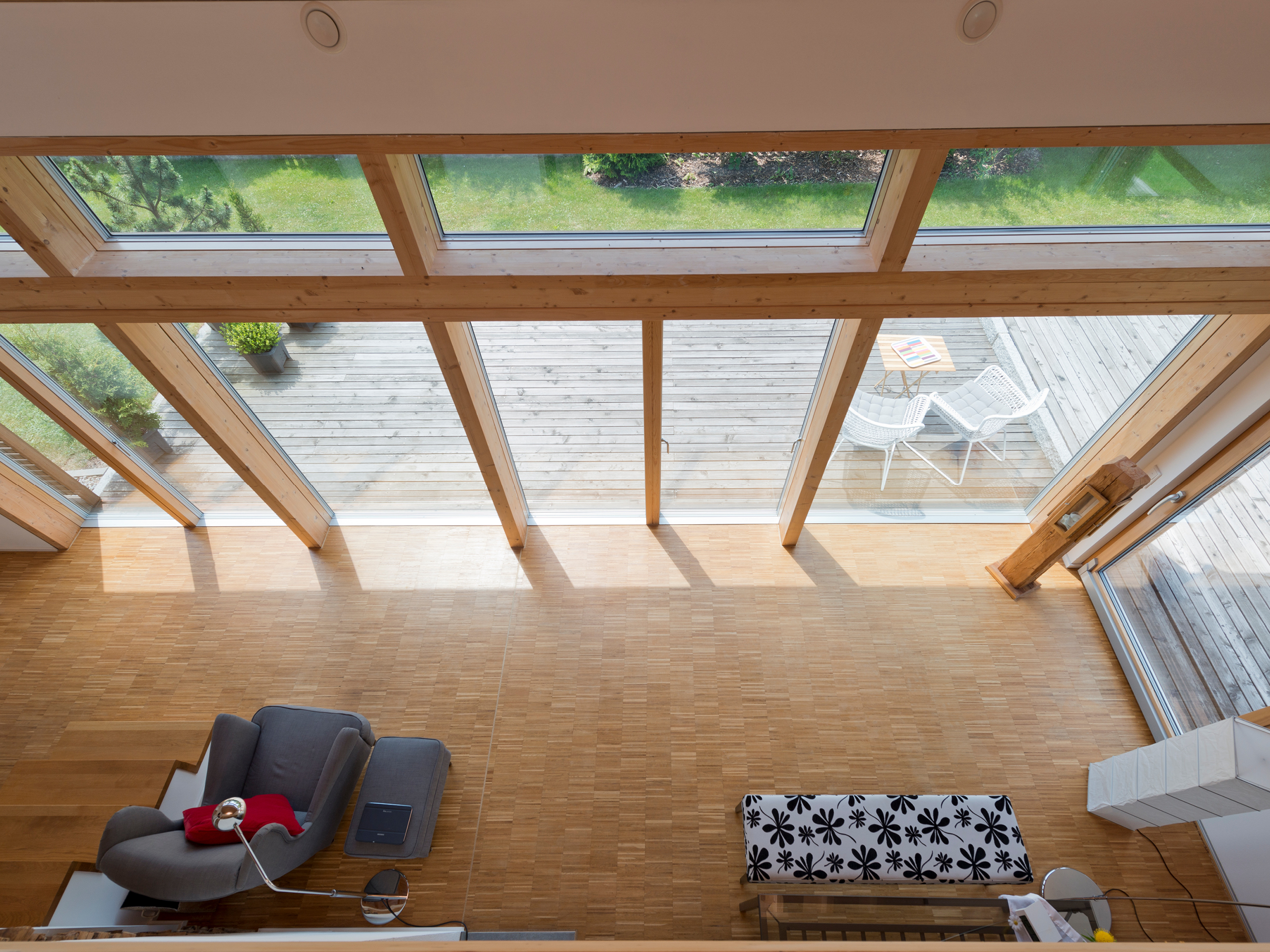 Kern des Wohnkonzepts ist ein auf zwei Ebenen verteiltes Wohnensemble mit Galerie: Unten befinden sich die Küche und ein offener, heller Essplatz, oben der Wohnbereich, bis unter den First offen und über einen französischen Balkon, ein Dachfenster und ein Lichtband im Zwerchgiebel belichtet. Diese Wohngalerie gehört zu den Bereichen, die das Ehepaar besonders zu schätzen weiß – umso mehr, als der Weg zu Schlafraum und Bad kurz ist und man sich dabei nur im geschützten Bereich bewegt.